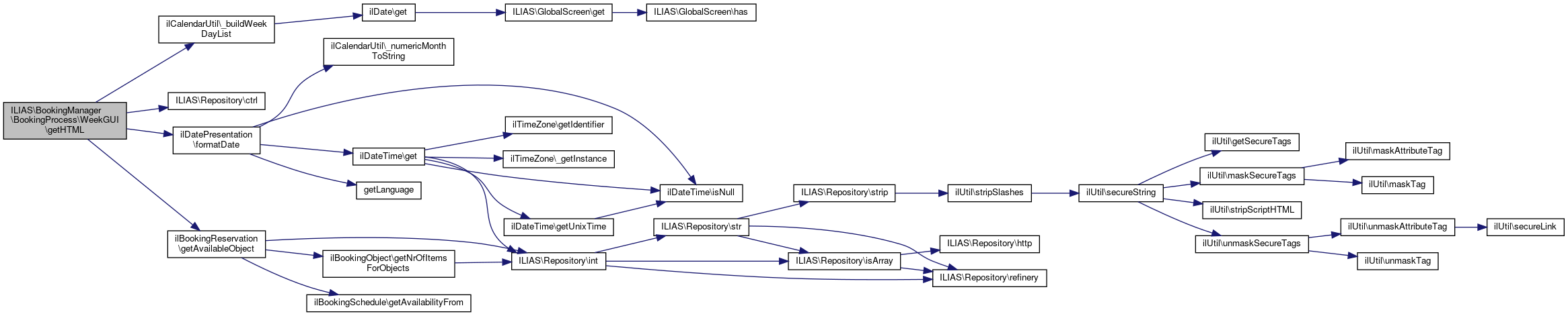 Here is the call graph for this function:| ILIAS\BookingManager\BookingProcess\WeekGUI::getHTML | ( | ) |