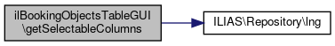 Here is the caller graph for this function:| ilBookingObjectsTableGUI::getSelectableColumns | ( | ) |