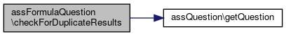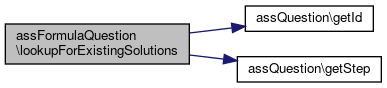 Here is the call graph for this function:| assFormulaQuestion::lookupForExistingSolutions | ( | int | $active_id, |