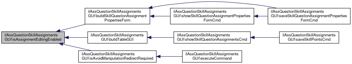 Here is the caller graph for this function:| ilAssQuestionSkillAssignmentsGUI::isAssignmentEditingEnabled | ( | ) |