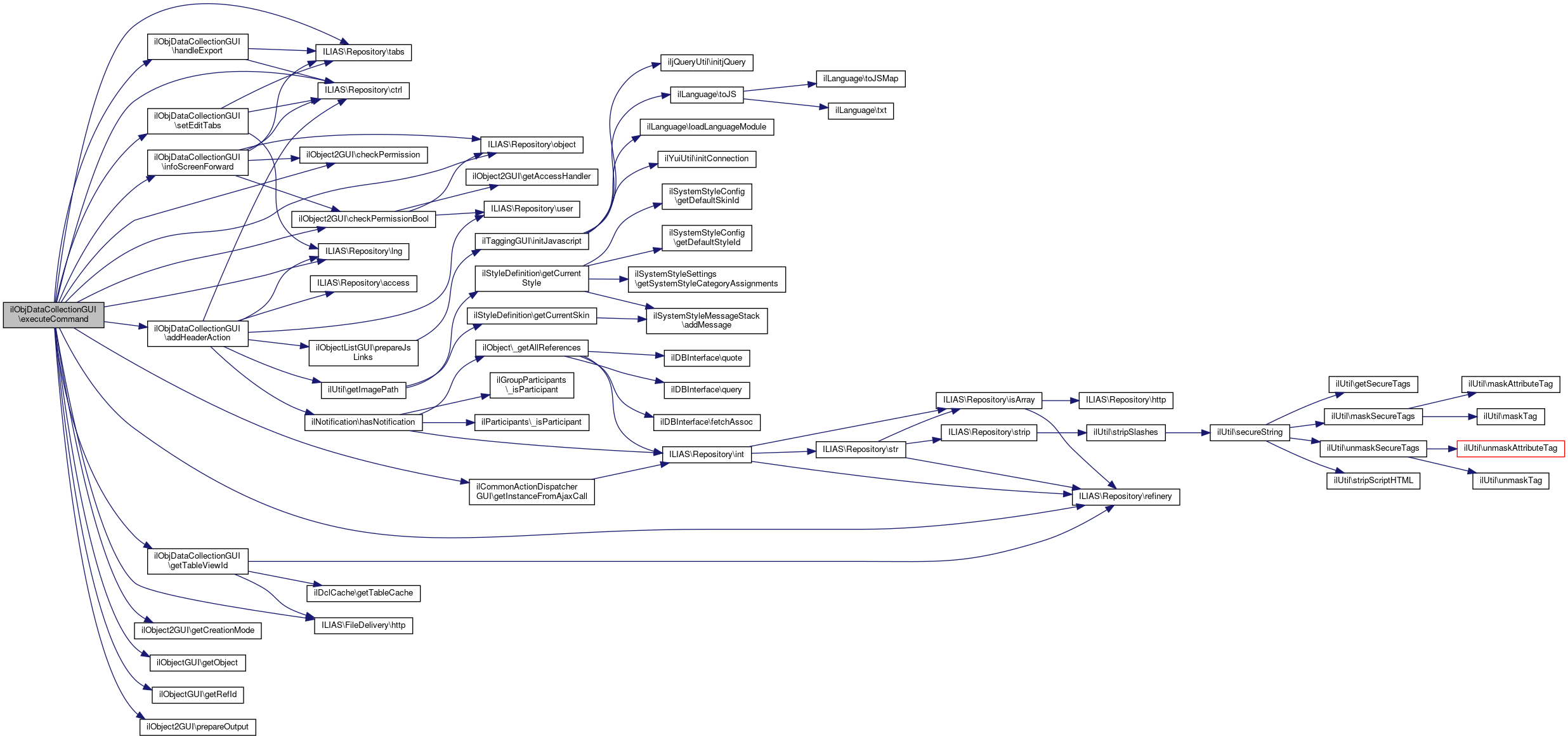 Here is the call graph for this function:| ilObjDataCollectionGUI::executeCommand | ( | ) |