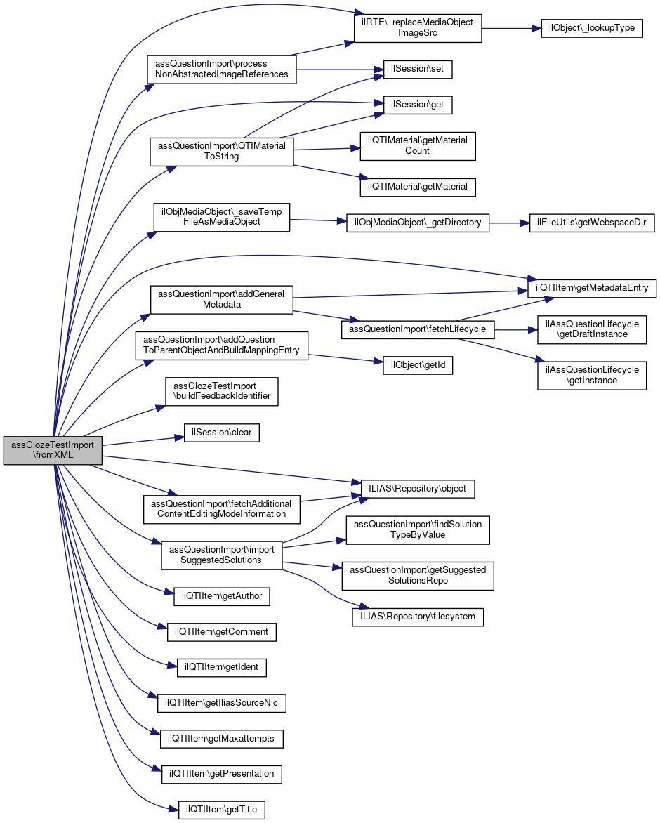 References $DIC, $response, ilRTE\_replaceMediaObjectImageSrc(), ilObjMediaObject\_saveTempFileAsMediaObject(), assQuestionImport\addGeneralMetadata(), assQuestionImport\addQuestionToParentObjectAndBuildMappingEntry(), buildFeedbackIdentifier(), ilSession\clear(), ilAssClozeTestFeedback\FB_MODE_GAP_QUESTION, assQuestionImport\fetchAdditionalContentEditingModeInformation(), ilQTIRenderFib\FIBTYPE_DECIMAL, ilQTIRenderFib\FIBTYPE_INTEGER, ilSession\get(), ilQTIItem\getAuthor(), ilQTIItem\getComment(), ilQTIItem\getIdent(), ilQTIItem\getIliasSourceNic(), ilQTIItem\getMaxattempts(), ilQTIItem\getMetadataEntry(), ilQTIItem\getPresentation(), ilQTIItem\getTitle(), IL_INST_ID, assQuestionImport\importSuggestedSolutions(), ILIAS\Repository\object(), assQuestionImport\processNonAbstractedImageReferences(), assQuestionImport\QTIMaterialToString(), assClozeGap\TYPE_NUMERIC, assClozeGap\TYPE_SELECT, and assClozeGap\TYPE_TEXT.