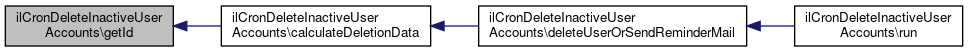 Here is the call graph for this function:| ilCronDeleteInactiveUserAccounts::getId | ( | ) |