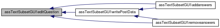 Here is the caller graph for this function:| assTextSubsetGUI::editQuestion | ( | bool | $checkonly = false,  |