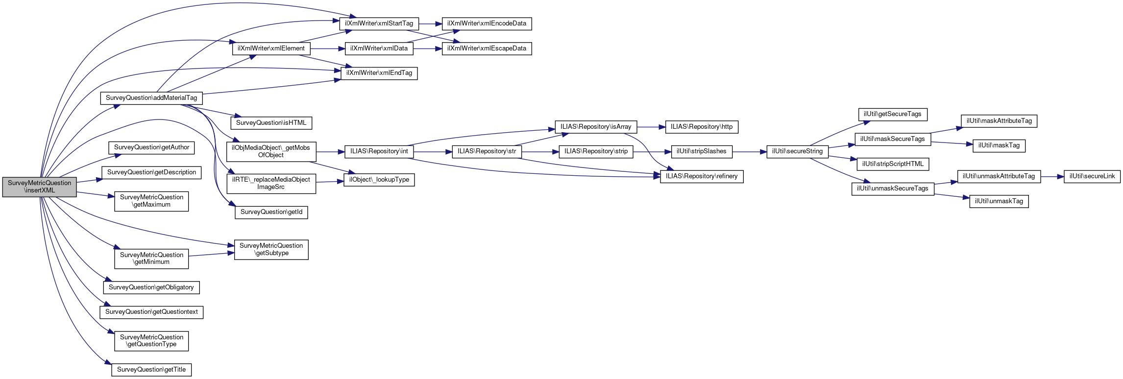 Here is the call graph for this function:| SurveyMetricQuestion::insertXML | ( | ilXmlWriter | $a_xml_writer, |