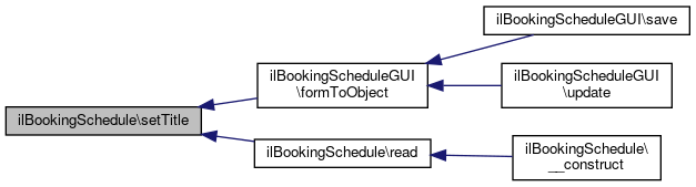 Here is the caller graph for this function:| ilBookingSchedule::setTitle | ( | string | $a_title | ) |