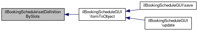 Here is the caller graph for this function:| ilBookingSchedule::setDefinitionBySlots | ( | array | $a_def | ) |
