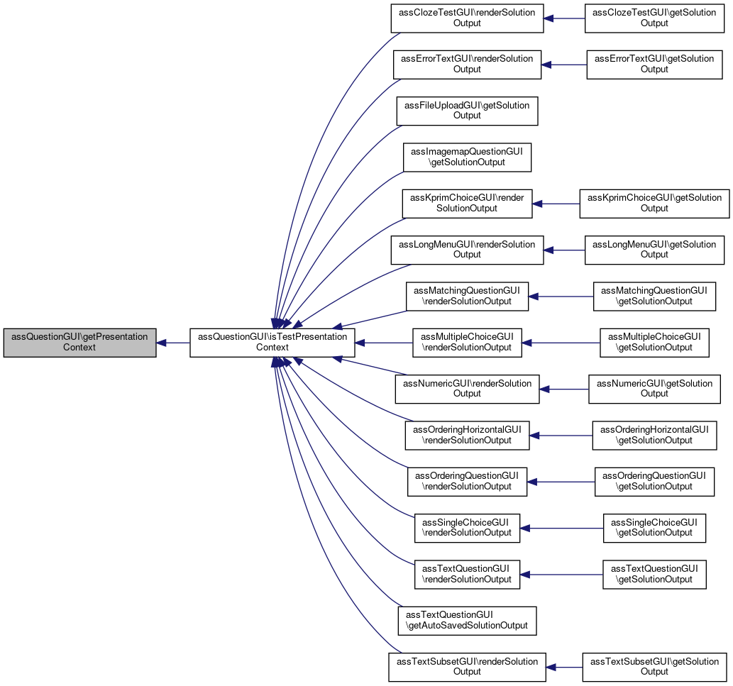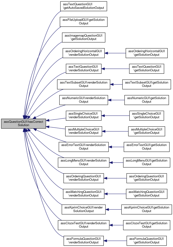 | getSolutionOutput (int $active_id, ?int $pass=null, bool $graphical_output=false, bool $result_output=false, bool $show_question_only=true, bool $show_feedback=false, bool $show_correct_solution=false, bool $show_manual_scoring=false, bool $show_question_text=true, bool $show_inline_feedback=true) | |