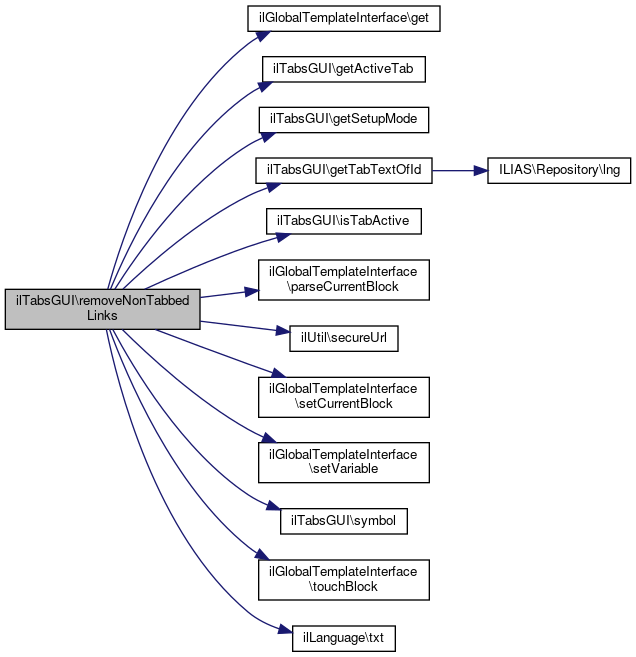 Here is the caller graph for this function:| ilTabsGUI::removeNonTabbedLinks | ( | ) |