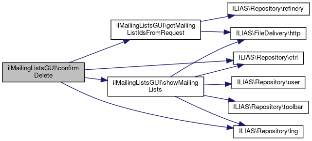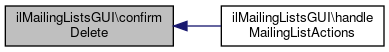 Here is the call graph for this function:| ilMailingListsGUI::confirmDelete | ( | ) |