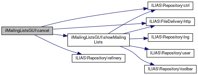 Here is the call graph for this function:| ilMailingListsGUI::cancel | ( | ) |
