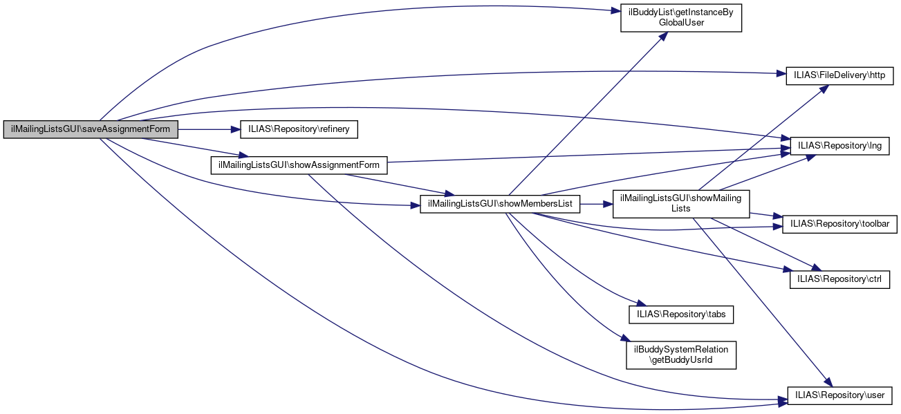 Here is the call graph for this function:| ilMailingListsGUI::saveAssignmentForm | ( | ) |
