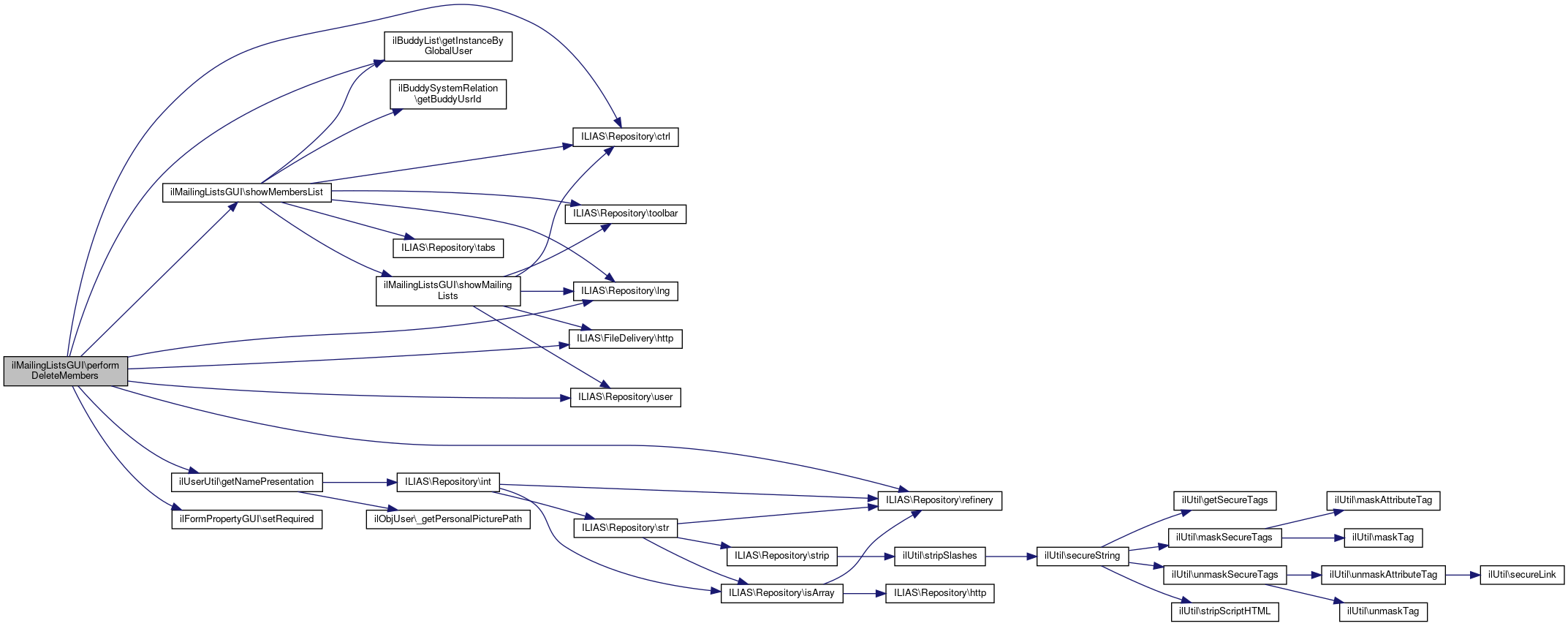 Here is the call graph for this function:| ilMailingListsGUI::performDeleteMembers | ( | ) |