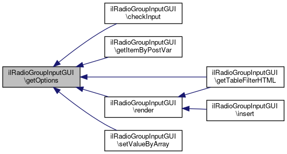 Here is the call graph for this function:| ilRadioGroupInputGUI::getOptions | ( | ) |
