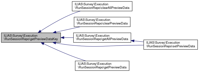 Referenced by ILIAS\Survey\Execution\RunSessionRepo\clearAllPreviewData(), ILIAS\Survey\Execution\RunSessionRepo\clearPreviewData(), ILIAS\Survey\Execution\RunSessionRepo\getAllPreviewData(), ILIAS\Survey\Execution\RunSessionRepo\getPreviewData(), and ILIAS\Survey\Execution\RunSessionRepo\setPreviewData().