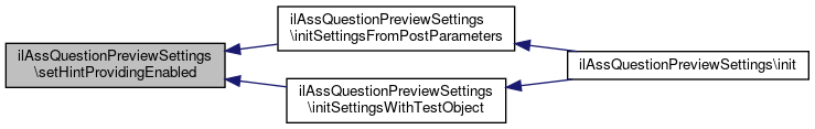 Here is the caller graph for this function:| ilAssQuestionPreviewSettings::setHintProvidingEnabled | ( | bool | $hintProvidingEnabled | ) |