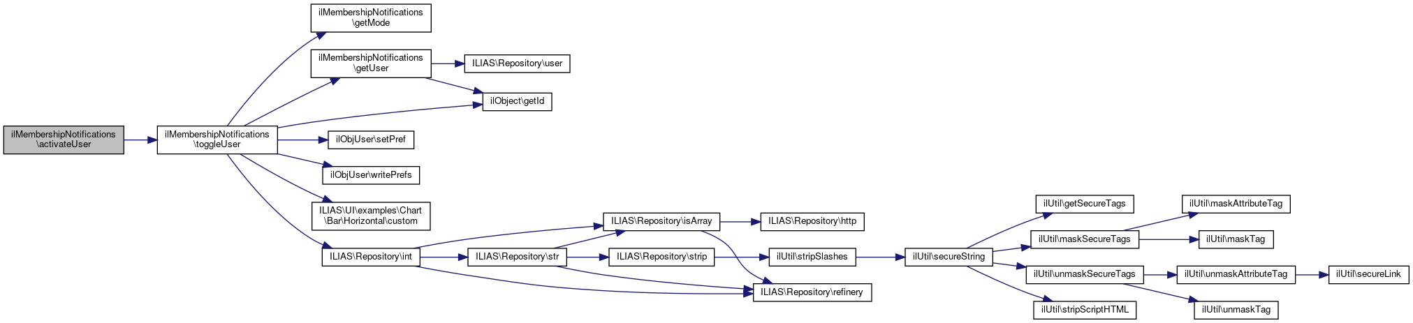 Here is the call graph for this function:| ilMembershipNotifications::activateUser | ( | int | $a_user_id = null | ) |