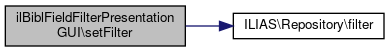 Here is the call graph for this function:| ilBiblFieldFilterPresentationGUI::setFilter | ( | ilBiblFieldFilterInterface | $filter | ) |