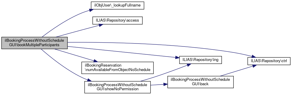 Here is the call graph for this function:| ilBookingProcessWithoutScheduleGUI::bookMultipleParticipants | ( | ) |