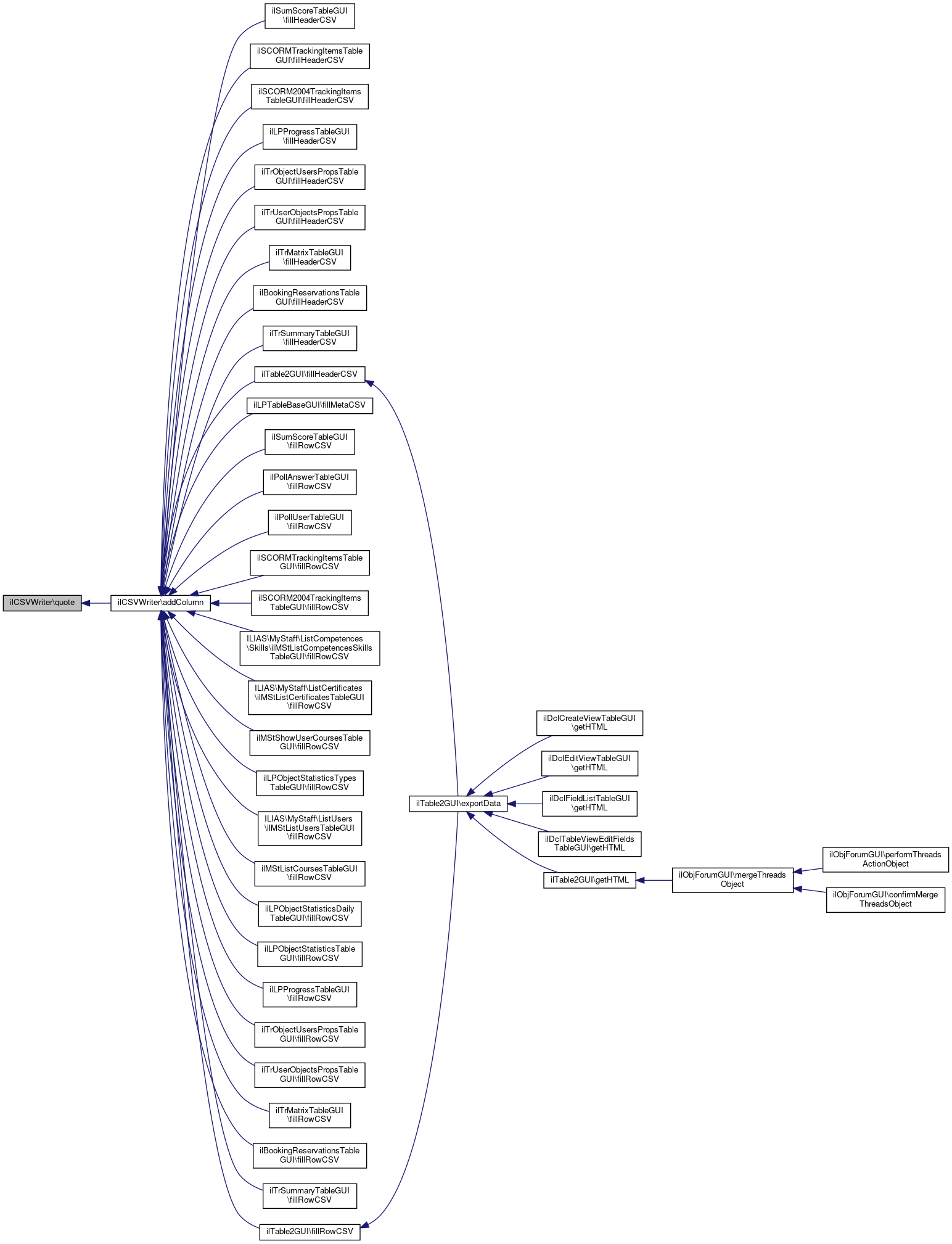 Referenced by ilSumScoreTableGUI\fillHeaderCSV(), ilSCORMTrackingItemsTableGUI\fillHeaderCSV(), ilSCORM2004TrackingItemsTableGUI\fillHeaderCSV(), ilLPProgressTableGUI\fillHeaderCSV(), ilTrObjectUsersPropsTableGUI\fillHeaderCSV(), ilTrUserObjectsPropsTableGUI\fillHeaderCSV(), ilTrMatrixTableGUI\fillHeaderCSV(), ilBookingReservationsTableGUI\fillHeaderCSV(), ilTrSummaryTableGUI\fillHeaderCSV(), ilTable2GUI\fillHeaderCSV(), ilLPTableBaseGUI\fillMetaCSV(), ilSumScoreTableGUI\fillRowCSV(), ilPollAnswerTableGUI\fillRowCSV(), ilPollUserTableGUI\fillRowCSV(), ilSCORMTrackingItemsTableGUI\fillRowCSV(), ilSCORM2004TrackingItemsTableGUI\fillRowCSV(), ILIAS\MyStaff\ListCompetences\Skills\ilMStListCompetencesSkillsTableGUI\fillRowCSV(), ILIAS\MyStaff\ListCertificates\ilMStListCertificatesTableGUI\fillRowCSV(), ilMStShowUserCoursesTableGUI\fillRowCSV(), ilLPObjectStatisticsTypesTableGUI\fillRowCSV(), ILIAS\MyStaff\ListUsers\ilMStListUsersTableGUI\fillRowCSV(), ilMStListCoursesTableGUI\fillRowCSV(), ilLPObjectStatisticsDailyTableGUI\fillRowCSV(), ilLPObjectStatisticsTableGUI\fillRowCSV(), ilLPProgressTableGUI\fillRowCSV(), ilTrObjectUsersPropsTableGUI\fillRowCSV(), ilTrUserObjectsPropsTableGUI\fillRowCSV(), ilTrMatrixTableGUI\fillRowCSV(), ilBookingReservationsTableGUI\fillRowCSV(), ilTrSummaryTableGUI\fillRowCSV(), and ilTable2GUI\fillRowCSV().