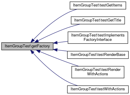 Here is the call graph for this function:| ItemGroupTest::testImplementsFactoryInterface | ( | ) |