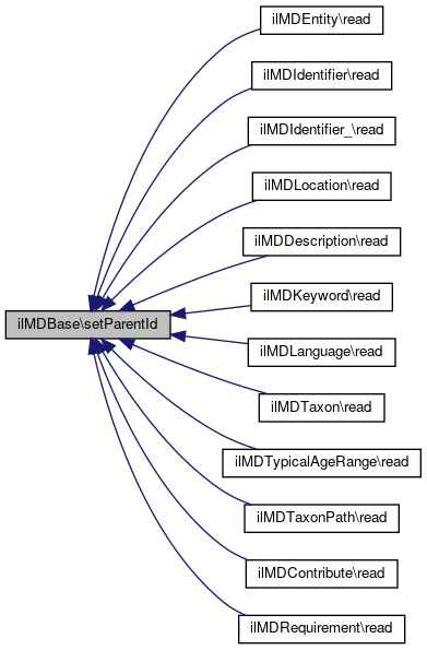 Here is the caller graph for this function:| ilMDBase::setParentId | ( | int | $a_id | ) |