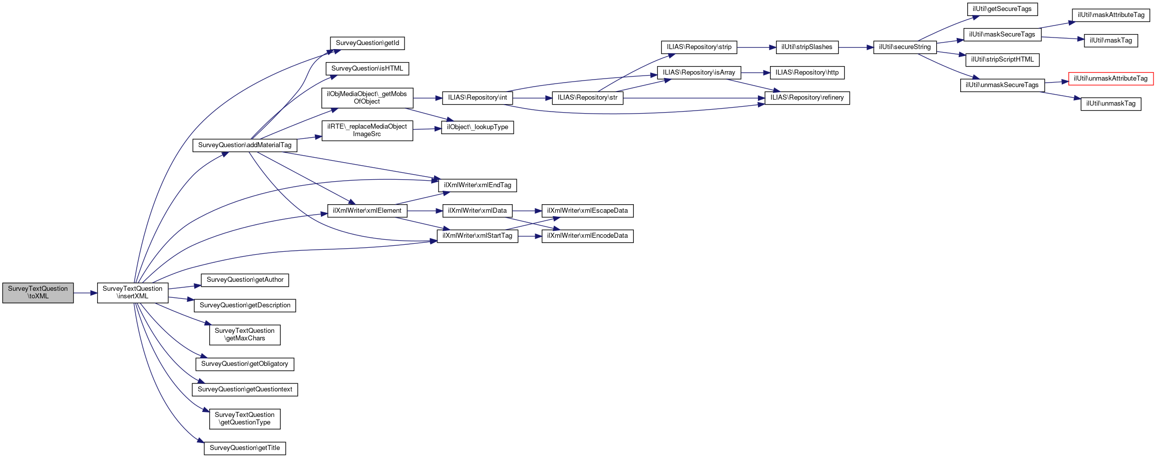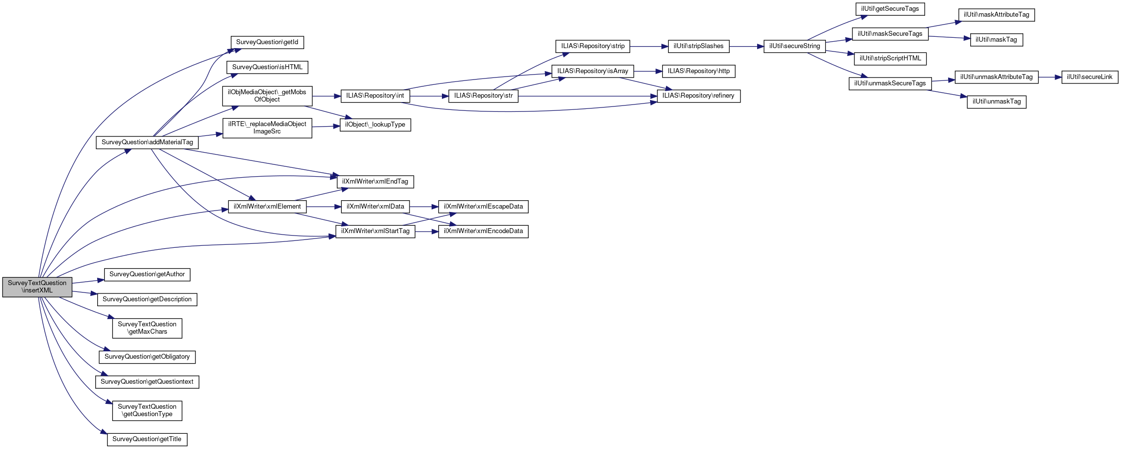 Here is the call graph for this function:| SurveyTextQuestion::insertXML | ( | ilXmlWriter | $a_xml_writer, |
