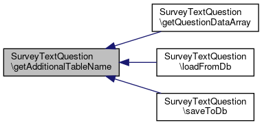 Here is the call graph for this function:| SurveyTextQuestion::getAdditionalTableName | ( | ) |