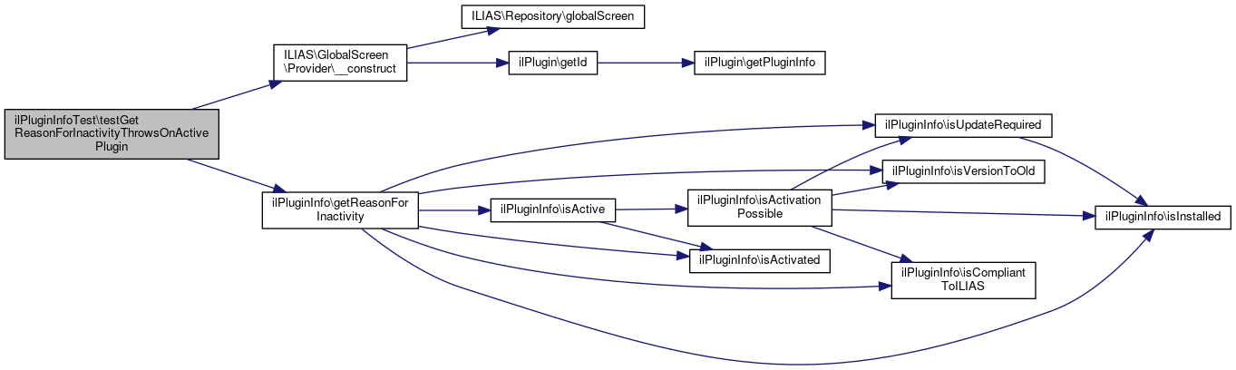 Here is the call graph for this function:| ilPluginInfoTest::testGetReasonForInactivityThrowsOnActivePlugin | ( | ) |
