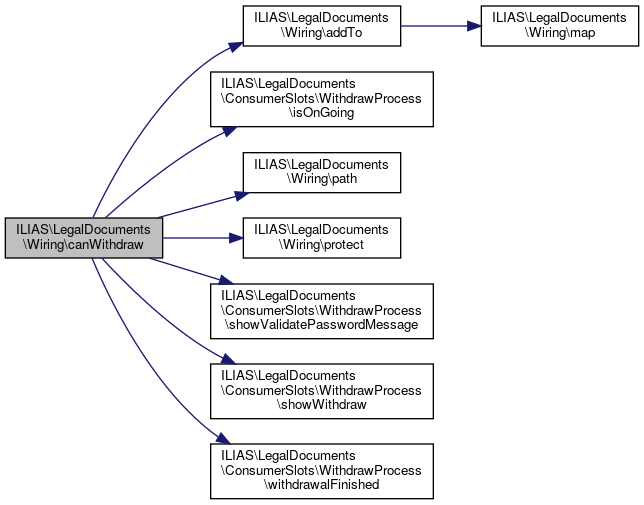 Here is the call graph for this function:| ILIAS\LegalDocuments\Wiring::canWithdraw | ( | WithdrawProcess | $withdraw_process | ) |