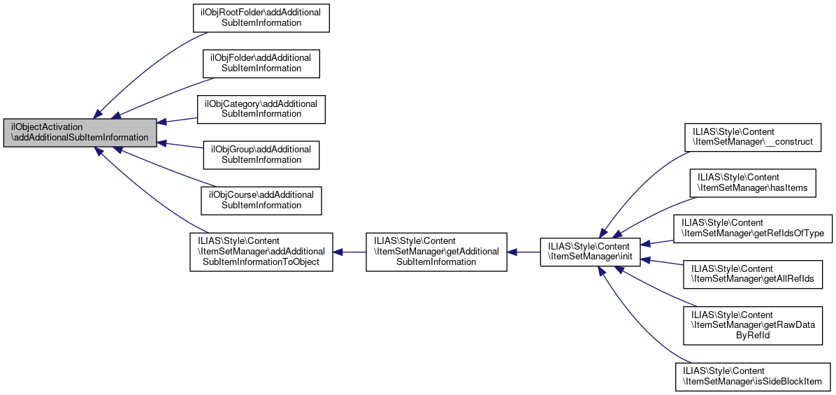 Referenced by ilObjRootFolder\addAdditionalSubItemInformation(), ilObjFolder\addAdditionalSubItemInformation(), ilObjCategory\addAdditionalSubItemInformation(), ilObjGroup\addAdditionalSubItemInformation(), ilObjCourse\addAdditionalSubItemInformation(), and ILIAS\Style\Content\ItemSetManager\addAdditionalSubItemInformationToObject().