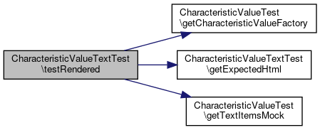 Here is the call graph for this function:| CharacteristicValueTextTest::testRendered | ( | ) |