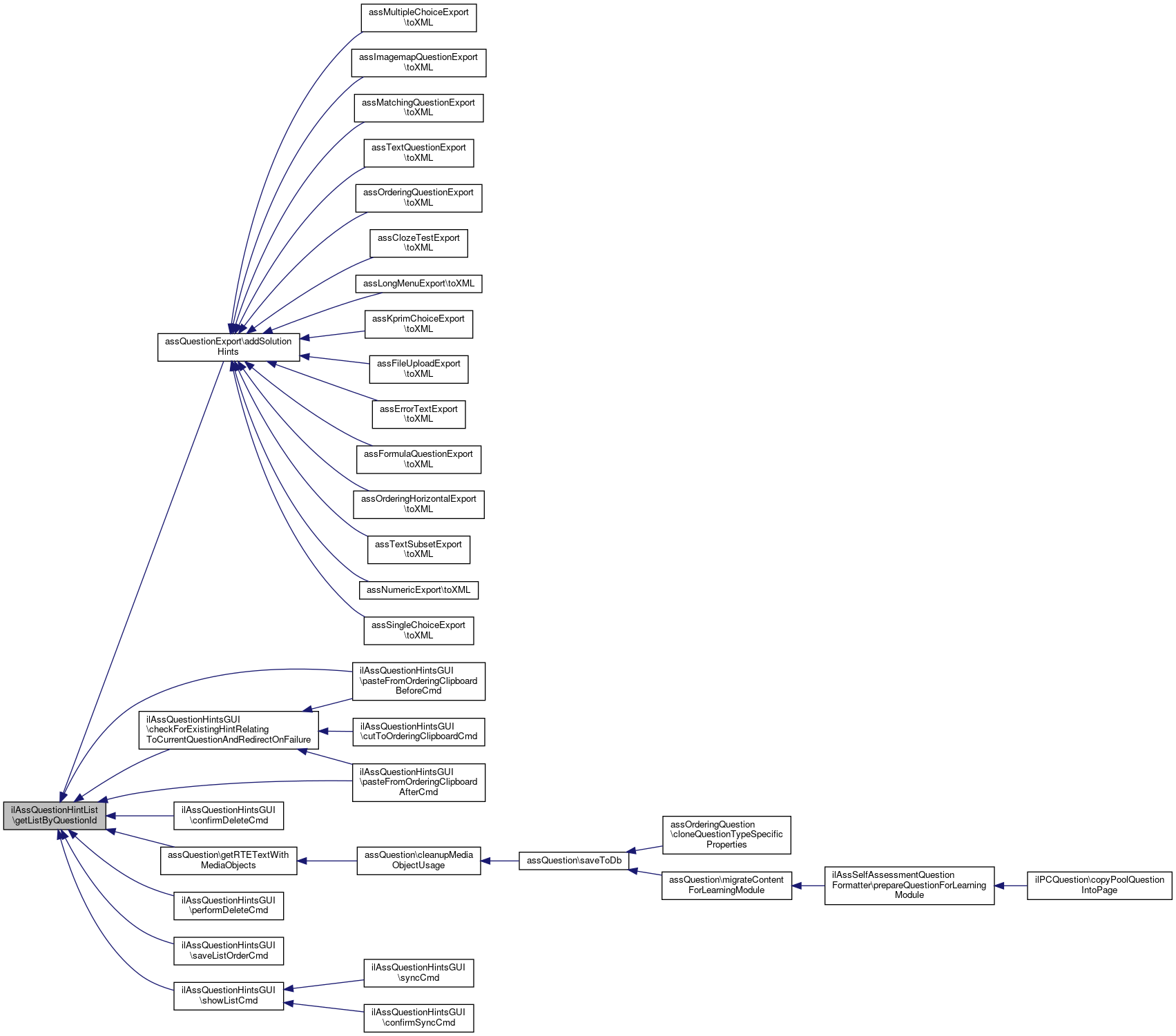 Referenced by assQuestionExport\addSolutionHints(), ilAssQuestionHintsGUI\checkForExistingHintRelatingToCurrentQuestionAndRedirectOnFailure(), ilAssQuestionHintsGUI\confirmDeleteCmd(), assQuestion\getRTETextWithMediaObjects(), ilAssQuestionHintsGUI\pasteFromOrderingClipboardAfterCmd(), ilAssQuestionHintsGUI\pasteFromOrderingClipboardBeforeCmd(), ilAssQuestionHintsGUI\performDeleteCmd(), ilAssQuestionHintsGUI\saveListOrderCmd(), and ilAssQuestionHintsGUI\showListCmd().