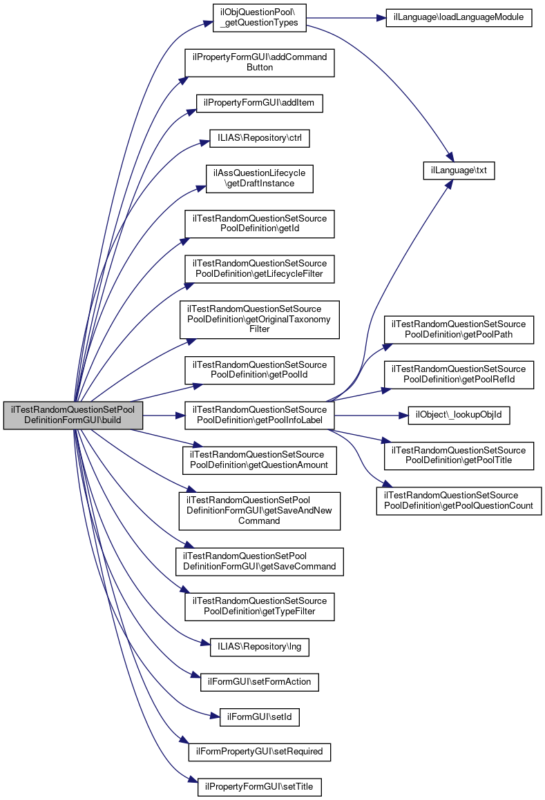 Here is the call graph for this function:| ilTestRandomQuestionSetPoolDefinitionFormGUI::build | ( | ilTestRandomQuestionSetSourcePoolDefinition | $sourcePool, |