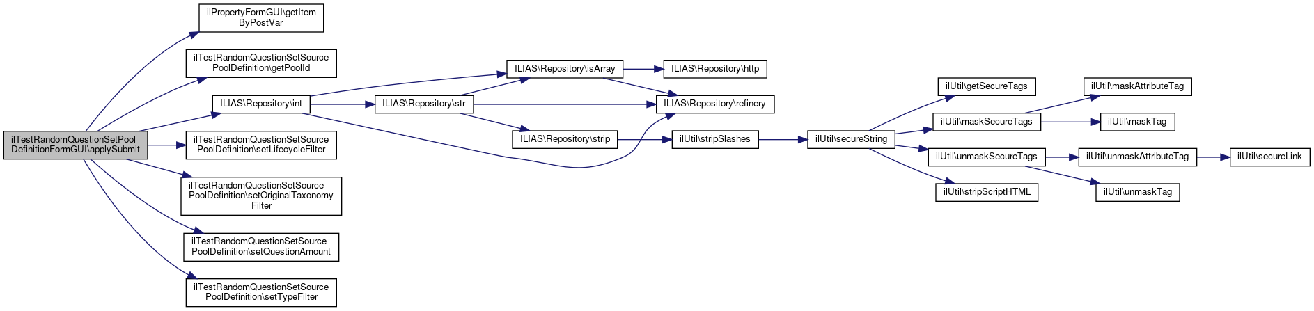 Here is the call graph for this function:| ilTestRandomQuestionSetPoolDefinitionFormGUI::applySubmit | ( | ilTestRandomQuestionSetSourcePoolDefinition | $source_pool_definition, |