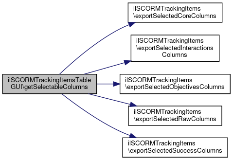 References ilSCORMTrackingItems\exportSelectedCoreColumns(), ilSCORMTrackingItems\exportSelectedInteractionsColumns(), ilSCORMTrackingItems\exportSelectedObjectivesColumns(), ilSCORMTrackingItems\exportSelectedRawColumns(), and ilSCORMTrackingItems\exportSelectedSuccessColumns().