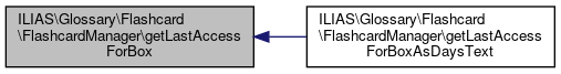 Here is the caller graph for this function:| ILIAS\Glossary\Flashcard\FlashcardManager::getLastAccessForBoxAsDaysText | ( | int | $box_nr | ) |