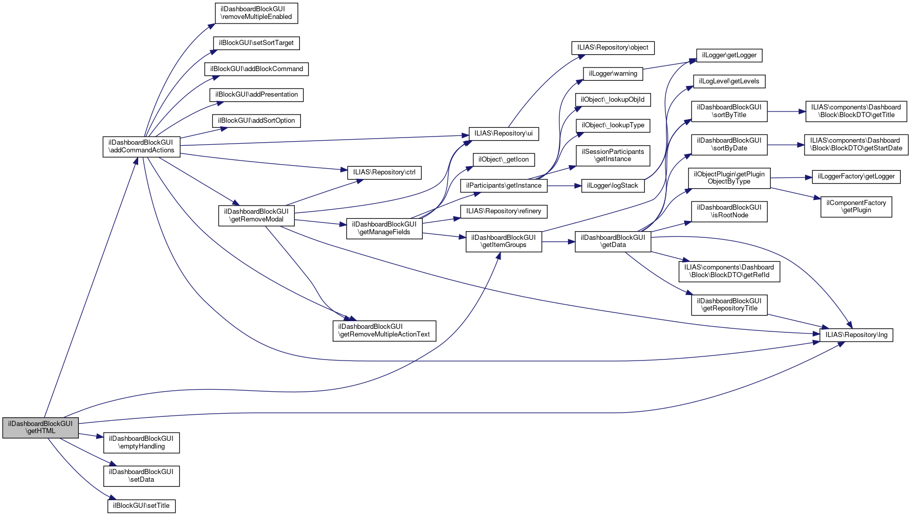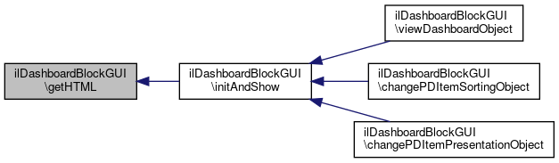 Here is the caller graph for this function:| ilDashboardBlockGUI::getHTML | ( | ) |