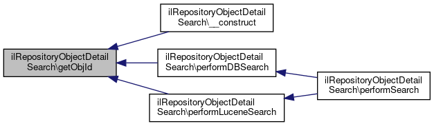 Here is the call graph for this function:| ilRepositoryObjectDetailSearch::getObjId | ( | ) |
