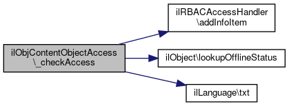 Here is the call graph for this function:| ilObjContentObjectAccess::_checkAccess | ( | string | $cmd, |