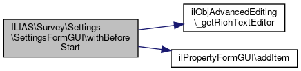 Here is the caller graph for this function:| ILIAS\Survey\Settings\SettingsFormGUI::withBeforeStart | ( | \ilPropertyFormGUI | $form | ) |