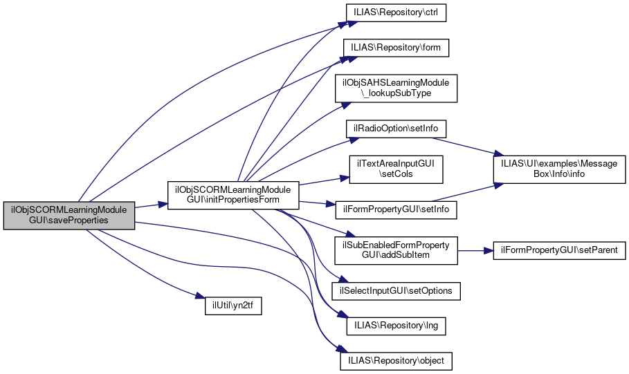 Here is the call graph for this function:| ilObjSCORMLearningModuleGUI::saveProperties | ( | ) |