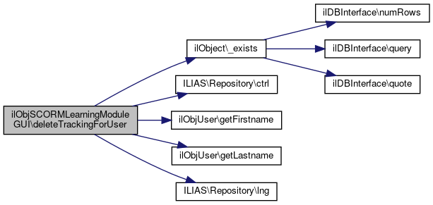 Here is the call graph for this function:| ilObjSCORMLearningModuleGUI::deleteTrackingForUser | ( | ) |