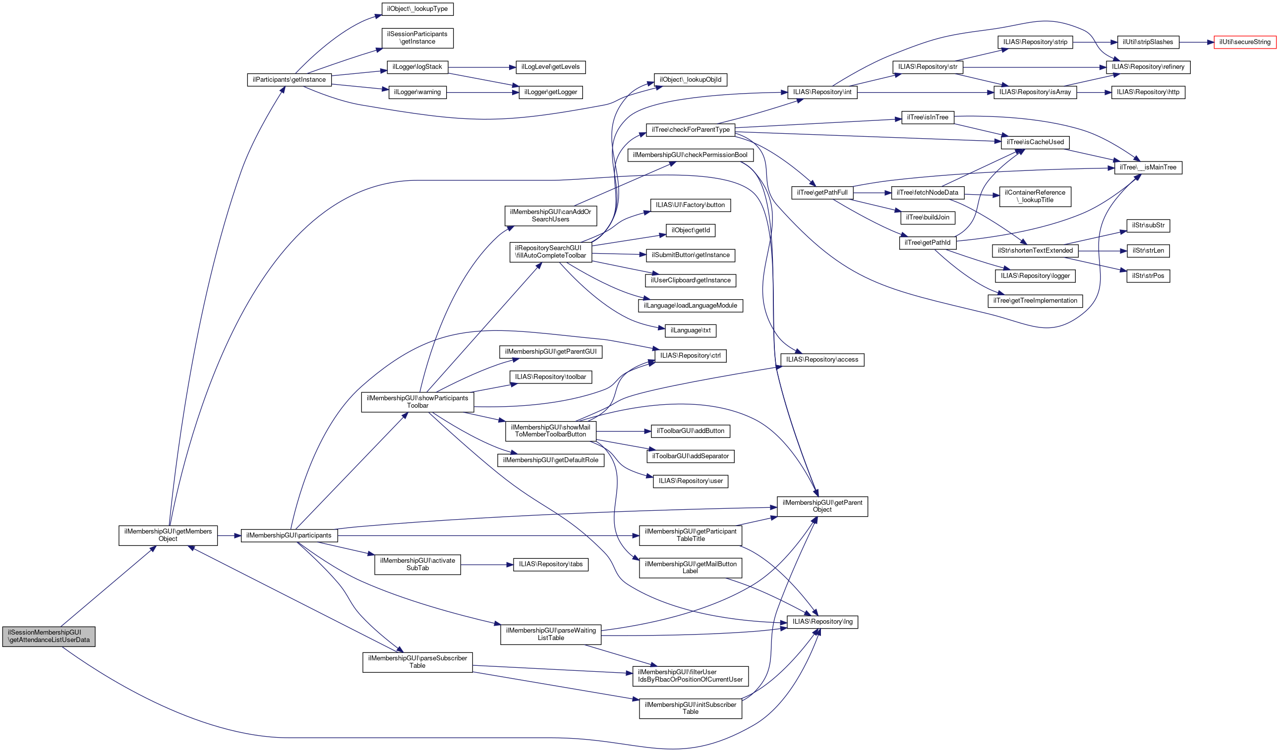 Here is the call graph for this function:| ilSessionMembershipGUI::getAttendanceListUserData | ( | int | $user_id, |