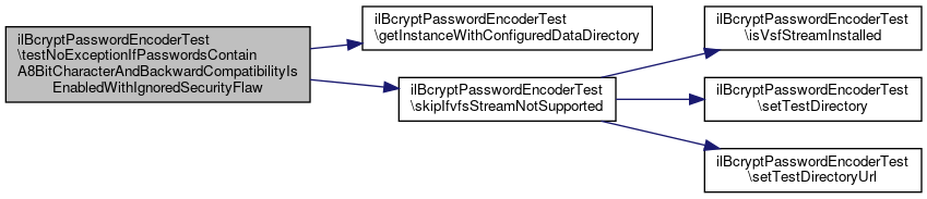 Here is the call graph for this function:| ilBcryptPasswordEncoderTest::testNoExceptionIfPasswordsContainA8BitCharacterAndBackwardCompatibilityIsEnabledWithIgnoredSecurityFlaw | ( | ) |