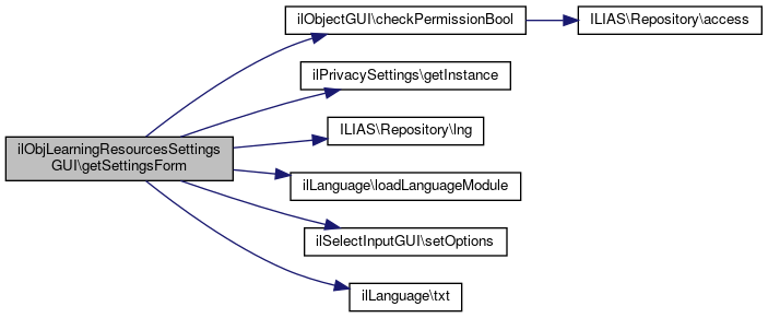Here is the call graph for this function:| ilObjLearningResourcesSettingsGUI::getSettingsForm | ( | ) |