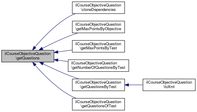 Here is the caller graph for this function:| ilCourseObjectiveQuestion::getQuestions | ( | ) |