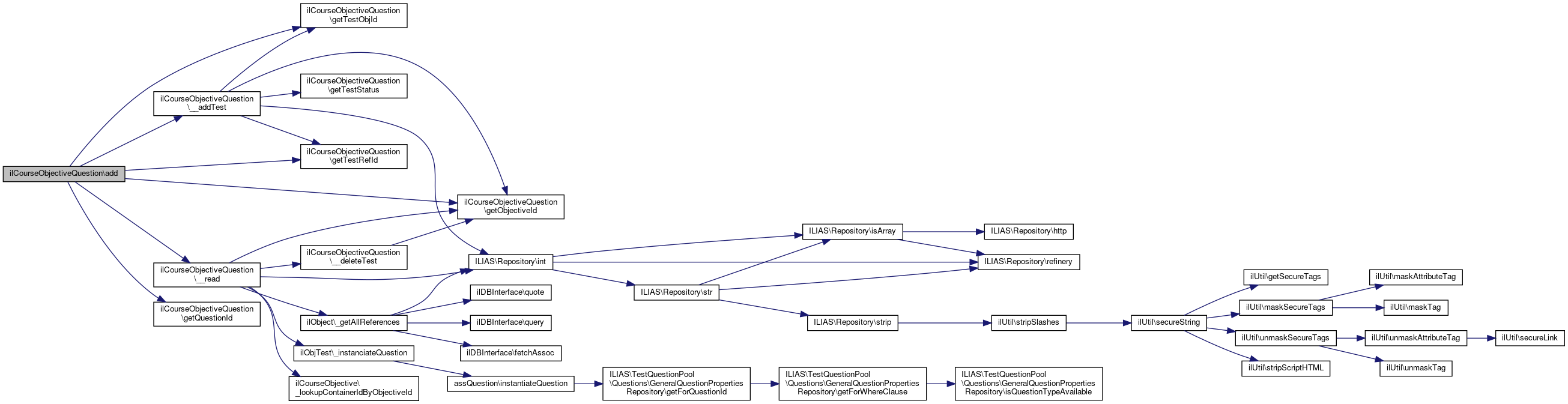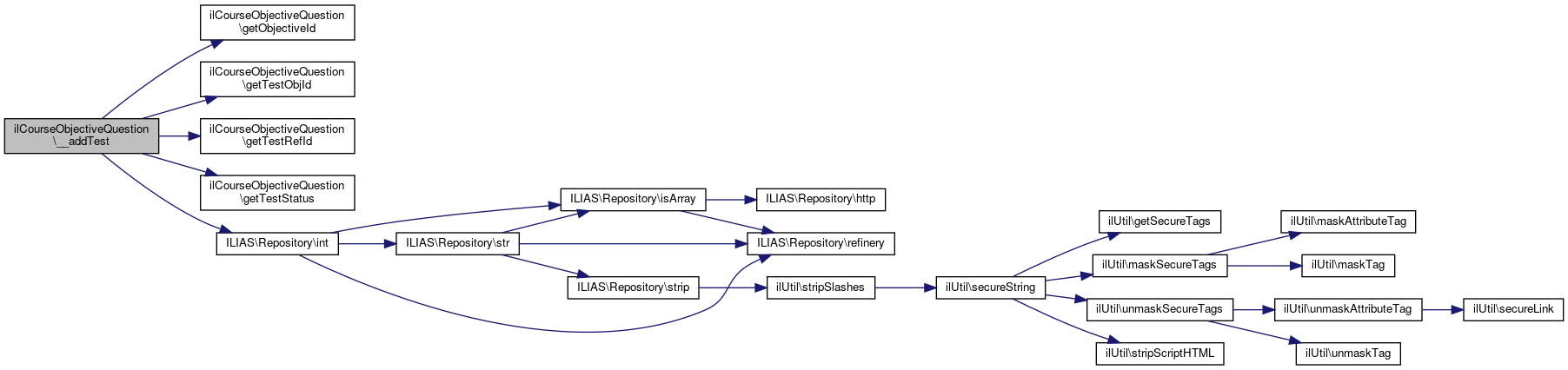 Here is the call graph for this function:| ilCourseObjectiveQuestion::__addTest | ( | ) |
