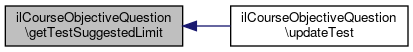 Here is the caller graph for this function:| ilCourseObjectiveQuestion::getTestSuggestedLimit | ( | ) |