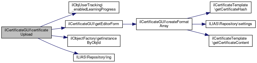Here is the call graph for this function:| ilCertificateGUI::certificateUpload | ( | ) |
